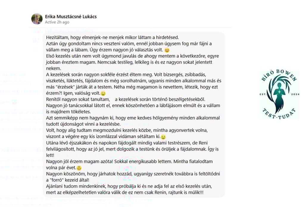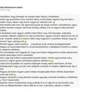 Ügyfelem tapasztalatai alapján ismét megerősítést kaptam, milyen hatékonyak a kezeléseim a tartós fájdalmak – különösen a váll-, láb- és derékpanaszok – enyhítésében.